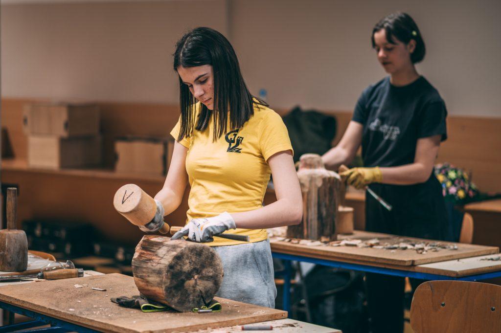 Dijakinje 3.U umetniške gimnazije likovne smeri so zaključile z drugo nalogo pri predmetu plastično oblikovanje; kiparjenje v lesu. “Les ni tako kot glina,” pravijo. Ustvarjale so pod mentorstvom akademskega kiparja Jureta Markote, ki jih je poleg strokovnega vodenja še spodbujal ter varoval pred poškodbami in žulji.