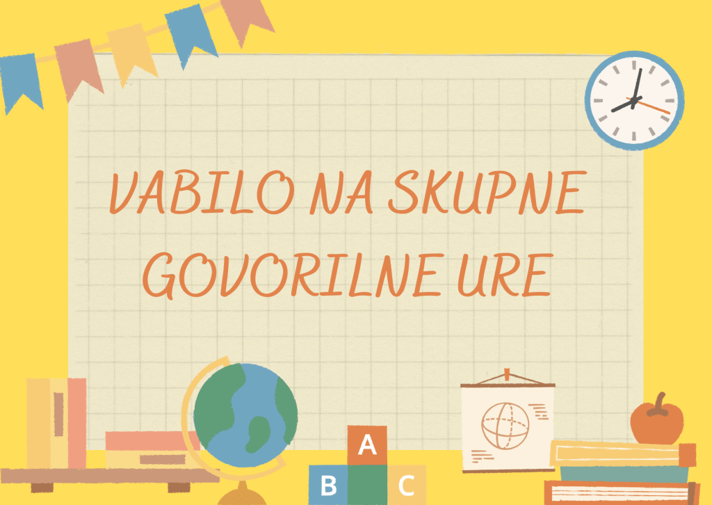 Obveščamo vas, da bodo v četrtek, 4. aprila 2024, skupne govorilne ure v šolskih prostorih. Učitelji bomo med 17. in 18. uro na razpolago za pogovor z vami. Prijazno vabljeni!